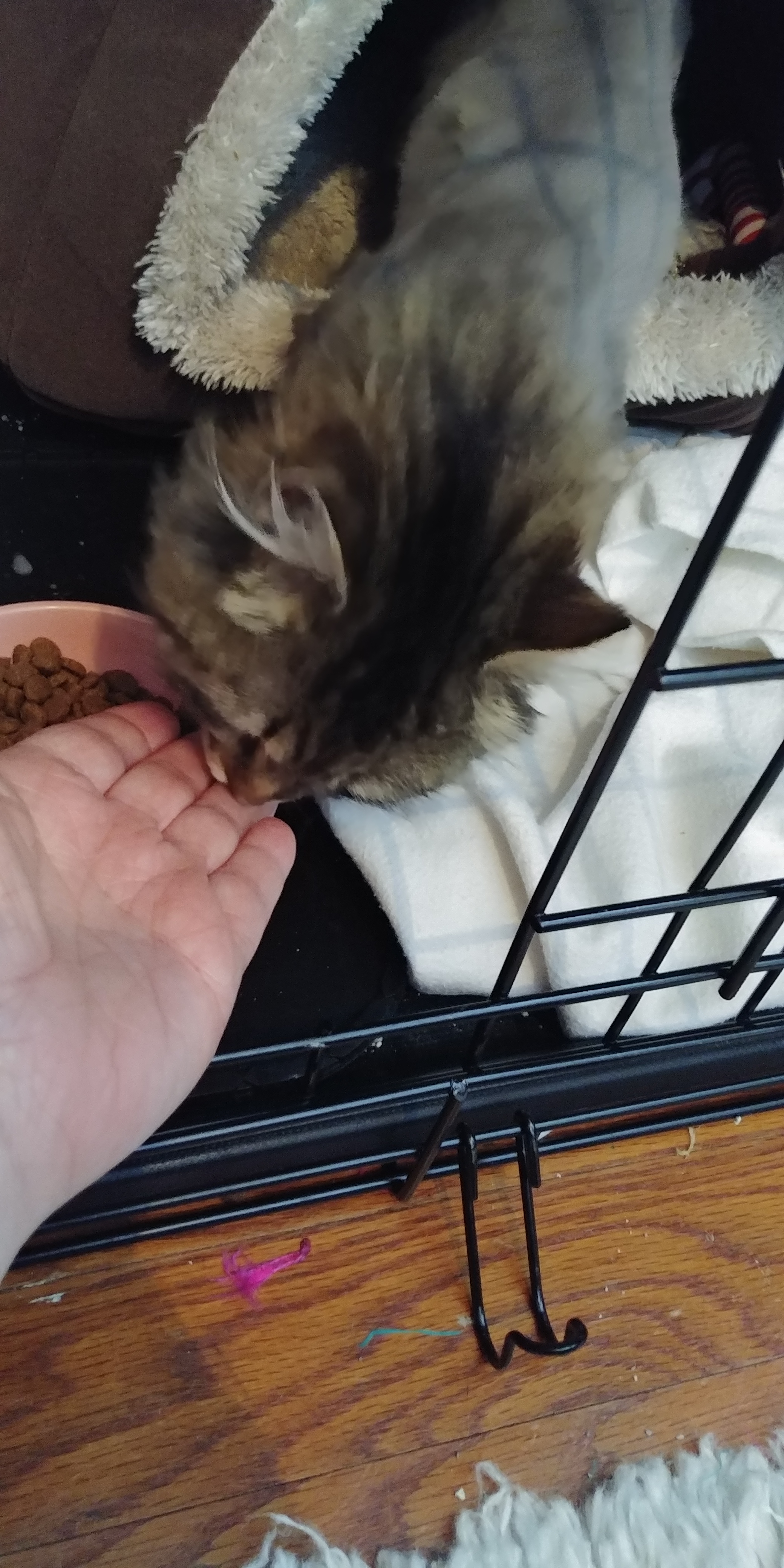 We were somewhat surprised when Deezle decided to venture out of the relative safety of her crate. She explored her room with more than a bit of caution. She enjoyed sleeping on a fuzzy blanket that was lying on the futon. We were thrilled she felt comfortable enough to sleep out in the open. She began meowing to get our attention. After the first couple weeks, she still didn’t want to accept pets, but she was really happy to enjoy the delicious chicken offered every day. Until…